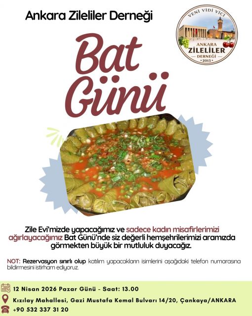 DAVETLİSİNİZ.... "BAT GÜNÜ" 12 NİSAN-PAZAR.... Kıymetli hemşehrilerim, Zile'mizin köklü mutfak kültürünün en özgün lezzetlerinden biri olan "BAT" sadece bir tat değil, geçmişten bu güne uzanan bir kültürün, paylaşmanın ve birlikteliğin simgesidir. Zile'mizin bereketli topraklarından doğan bu eşsiz lezzeti tanıtmak, yaşatmak ve gelecek nesillere aktarmak amacıyla düzenlediğimiz "BAT GÜNÜ" etkinliğimizi aynı zamanda geleneksel hale getirmek istiyoruz. Bu sebeple siz değerli hemşehrilerimizle bir araya gelmekten büyük mutluluk duyacağız. Bu anlamlı günde, sofralarımızı sadece BAT ile değil; dostlukla, samimiyetle ve dayanışma ruhuyla da donatırıyoruz. Kültürümüzü yaşatan, geleneklerimizi ayakta tutan tüm hemşehrilerimize ayrı ayrı teşekkür ediyor, bu güzel lezzeti birlikte tatmaya ve bu özel güne ortak olmaya davet ediyoruz. NOT ; Her ne kadar tüm hemşehrilerimizi ağırlamak istesekte Zile Evimizin mevcut şartları nedeniyle katılım sınırımız bulunmaktadır. Ayrıca sadece kadın hemşehrilerimiz bu etkinliğimize katılabileceklerdir. Anlayışınız için şimdiden teşekkür ediyoruz. ABDULKADİR ŞAHİN Ankara Zileliler Derneği Yönetim Kurulu Başkanı |